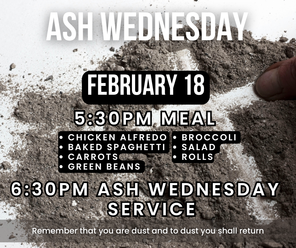 On February 18th we will have a Fellowship Meal and Ash Wednesday Service. The meal will begin at 5:30 and the Service will begin at 6:30.